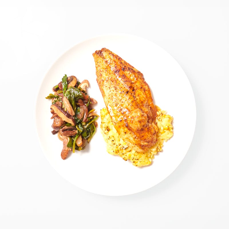Your new favorite weeknight dinner or lunch is served up in seconds thanks to this light and tasty meal. Local red fish pairs perfectly with a smoky ancho chile compound butter and a hearty side of sautéed spinach, caramelized onions, and mushrooms. A gluten-free corn pudding adds a little richness to round out the meal.