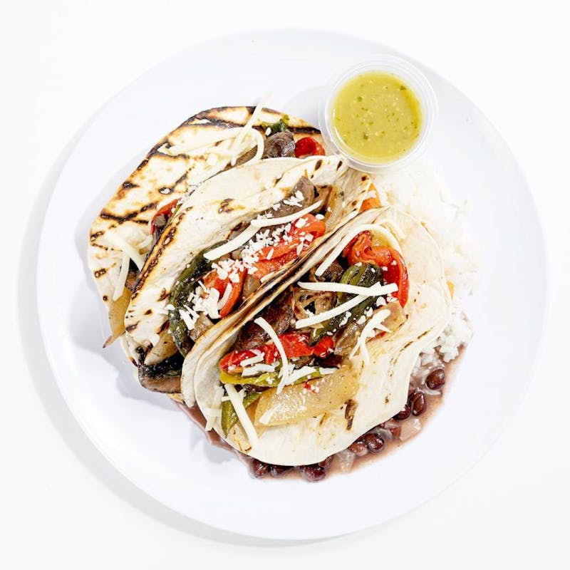Raised in San Antonio, fajitas were a weekend staple for Chef Maribel, and her version lets you build your own fajita-inspired tacos with flour tortillas, char-grilled veggies, and all the traditional toppings. Fill your tacos with fresh-off-the-grill portobello mushrooms, poblano and bell peppers, onions, which are made even more delicious when tucked into soft flour tortillas and topped with pepperjack cheese. Served with a side of steamed rice and Chef's handmade spicy fire-roasted tomato salsa, this veggie-forward meal makes for a super satisfying Taco Tuesday, any day of the week.