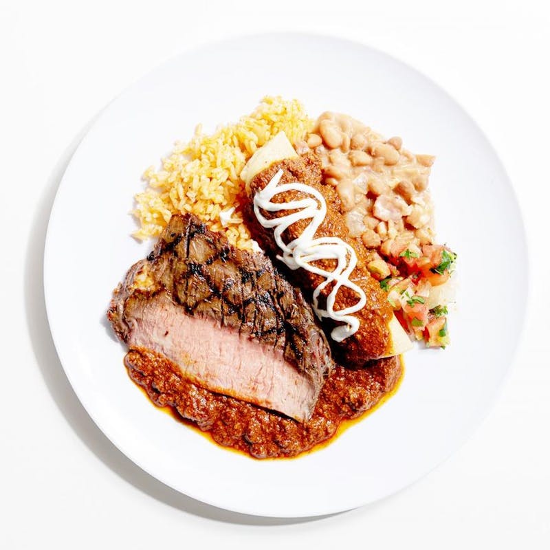 The ultimate meal to crush your hangry mood. Enjoy a veritable feast of tender flat iron steak and one cheese enchilada with a beef and ancho chile sauce, red rice and charro beans—Cowboy-style stewed pinto beans. Top with pico de gallo to complete this meal that's a hearty meal to satisfy even the hungriest Texas cowboy