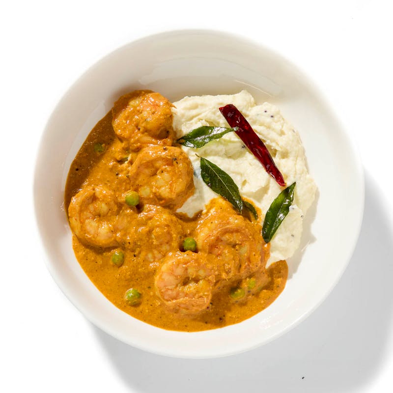 This Kerala-style duo brings together two deeply comforting elements: a silky curry-leaf tempered cauliflower mash and a vibrant shrimp curry enriched with coconut milk, fennel, and garam masala. Every spoonful carries the earthy heat of the South Indian coast, balanced by the light, buttery texture of the cauliflower and the warmth of sautéed shallots.