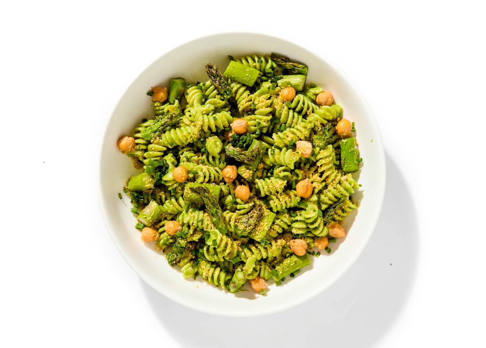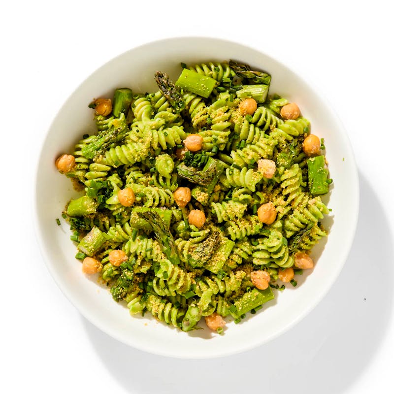 Chef Meena's bright, plant-based pasta bowl features a basil–spinach green goddess dressing, with roasted asparagus, peas, chickpeas, and walnut-based vegan parm. Chives add a final green flourish.