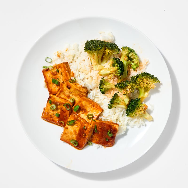 Gochujang is a sweet, spicy, salty sauce, and a Korean cooking essential. Here, it’s used as the marinade for slices of extra-firm tofu, which are fried until golden before being marinated. Paired with steamed broccoli, fluffy white rice, and fresh scallions, this dish perfectly balances heat and freshness.