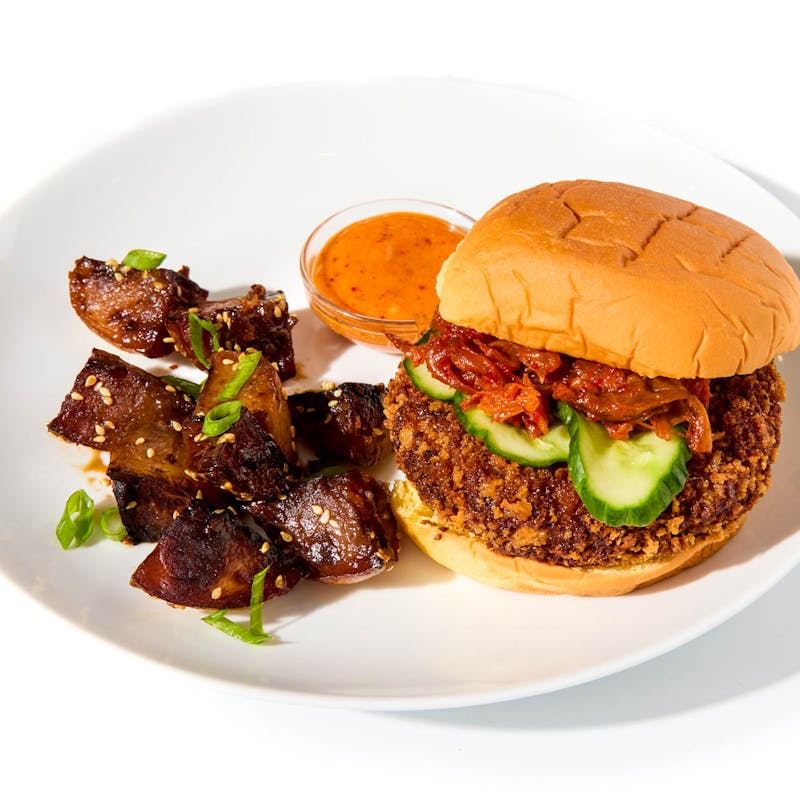 Chef Paul takes the burger on a detour via Seoul: a salmon patty seasoned with gochujang, sesame, chives, and ginger, then coated in panko and fried until golden. It’s topped with a sticky-sweet kimchi jam, layered with refreshing cucumber slices, and stacked on a soft potato bun. Alongside: Yukon potatoes braised in soy and mirin, and a gochujang-spiked aioli that pulls everything together with a sweet-and-spicy kick.