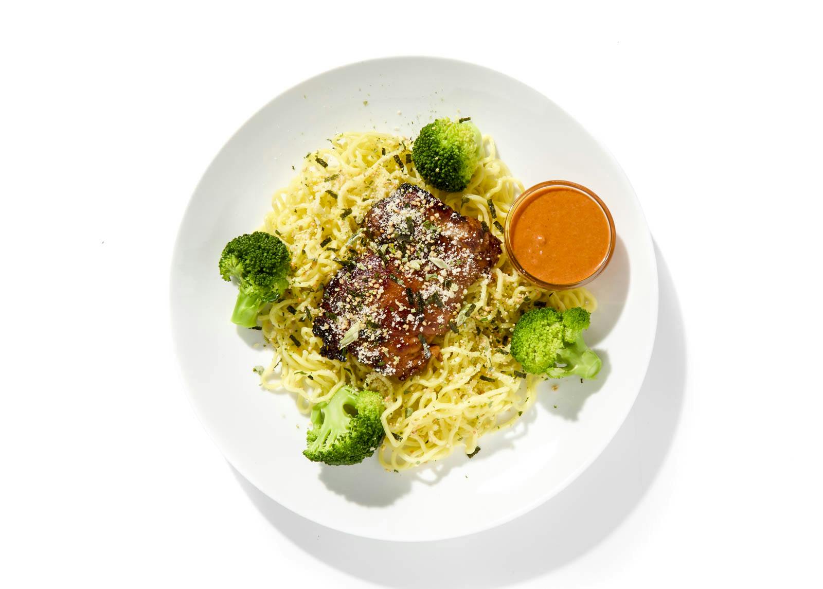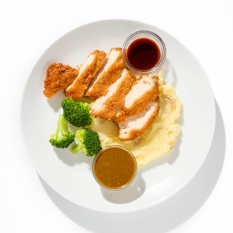 Crispy panko chicken gets paired with two punchy sauces: a creamy red curry full of garlic and coconut, and a sweet-savory yaki udon–style sauce. On the side, you’ll find miso garlic mashed potatoes balanced with steamed broccoli.