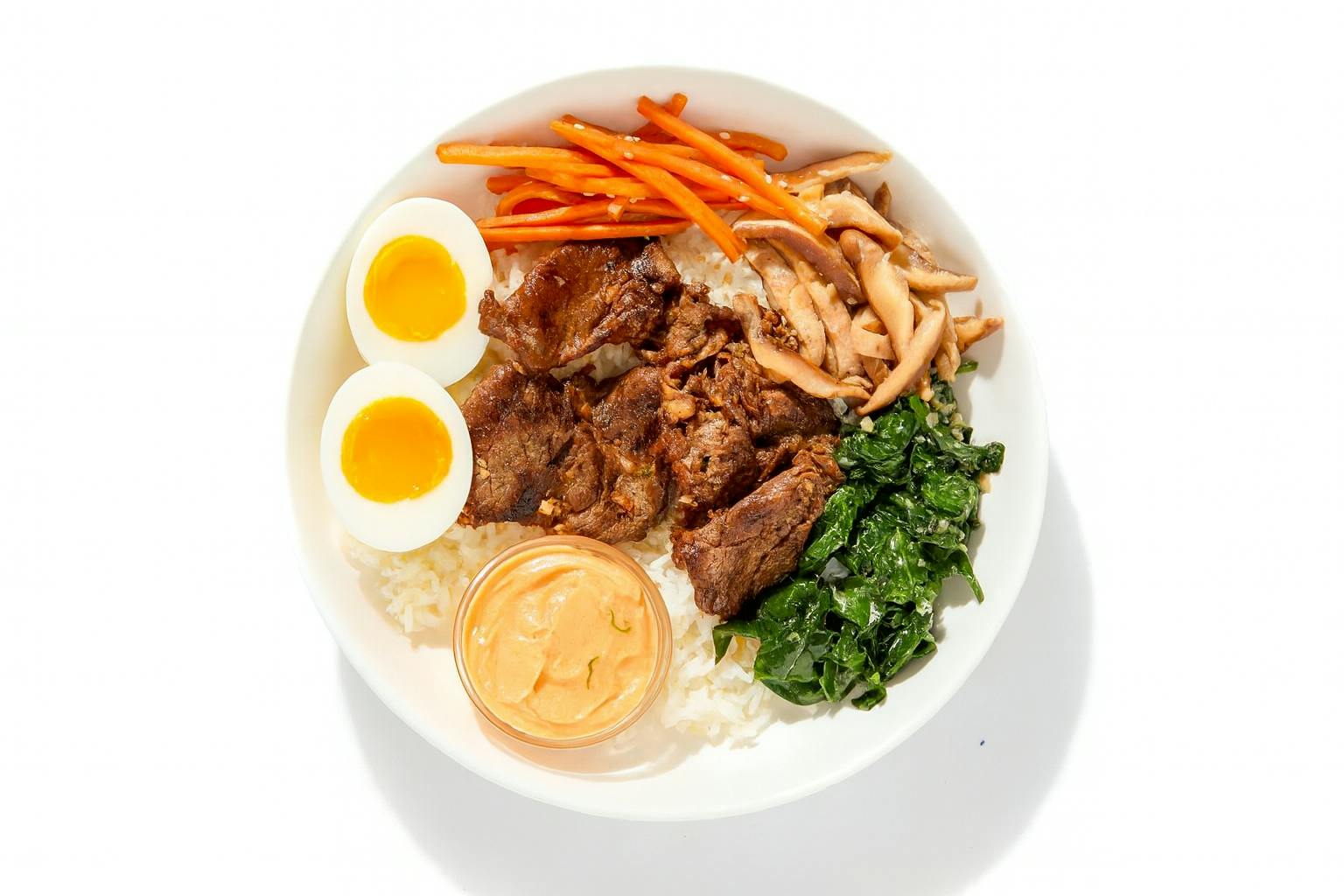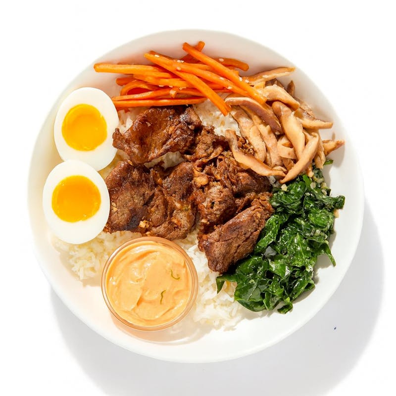 Rib-Eye Beef, Basmati Rice, Egg, Carrots, Shiitake Mushrooms, Spinach, Butter, Garlic, Onion, Rice Wine, Sake, Gochujang Sauce, Light Soy Sauce, Sugar, Sesame Oil, Soy Sauce, Rice Wine Vinegar, Green Onion, Toasted Sesame Oil, Ginger, Honey, Kosher Salt, Black Pepper