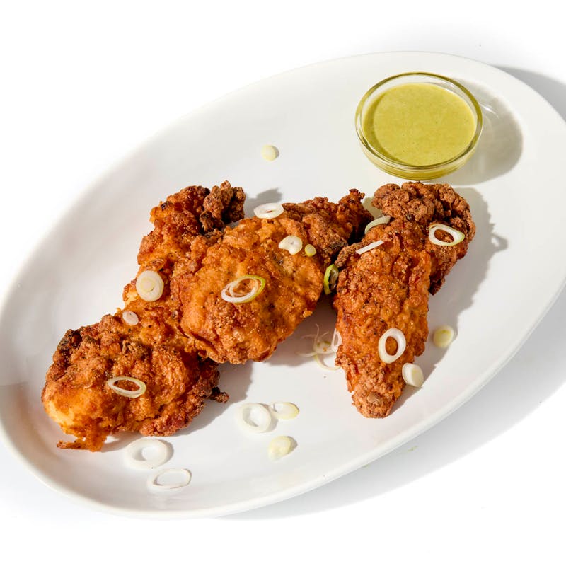 These golden, crisp chicken tenders are a flavor deep dive into Korean street food. Marinated in a punchy gochujang-soy sauce blend, dredged in a mix of corn and potato starch, and fried until perfectly golden, they pack a gentle heat and serious crunch. On the side ia Chef Suh's original "GGS" aioli—an umami-rich dipping sauce layered with soy, sesame, garlic, honey, lime, and Kewpie mayo. Chef Suh’s creation walks the line between comforting and craveable, with just enough zing to keep you coming back.