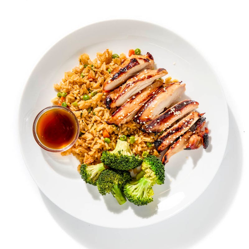 In Chef Paul's take on the comfort classic, tender soy-mirin glazed chicken thighs bring deep umami, while hibachi-style fried rice—studded with peas, carrots, and scrambled egg—adds gentle sweetness. Steamed broccoli keeps things snappy, and a side of teriyaki sauce lets you dial in the flavor hit.