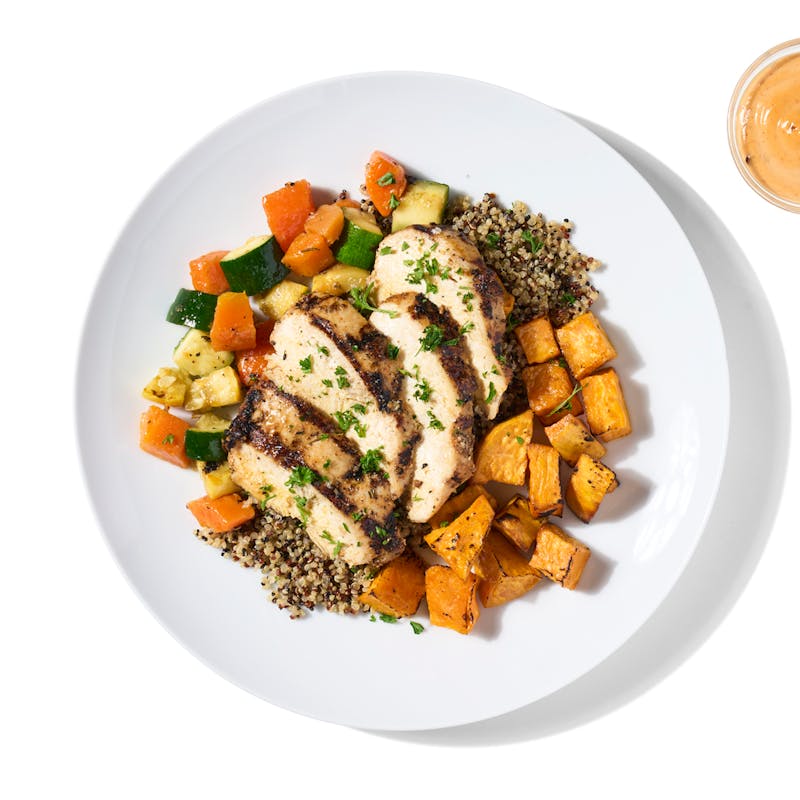 Cajun-spiced chicken gets a beautiful char from the grill, then sits atop nutty tri-color quinoa. Roasted sweet potatoes and grilled squash bring color and sweetness, while a creamy chipotle-Cajun sauce ties it all together with a smoky kick.