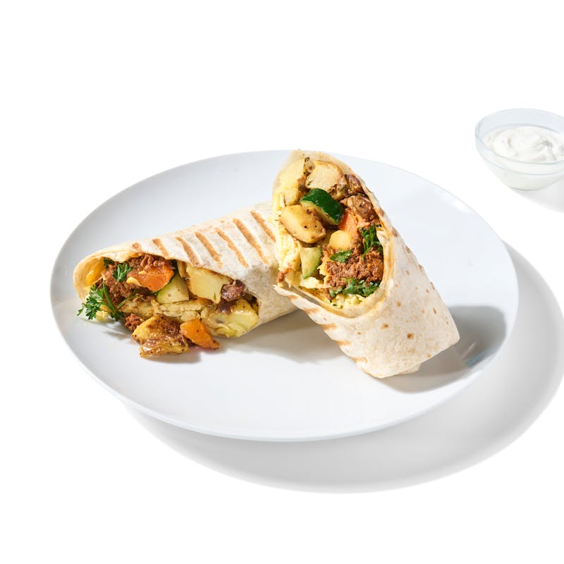 This brunch-for-anytime burrito wraps up all the hits: creamy scrambled eggs, sharp cheddar, rosemary potatoes, soy chorizo, and grilled squash—all tucked into a flour tortilla and served with a side of sour cream.