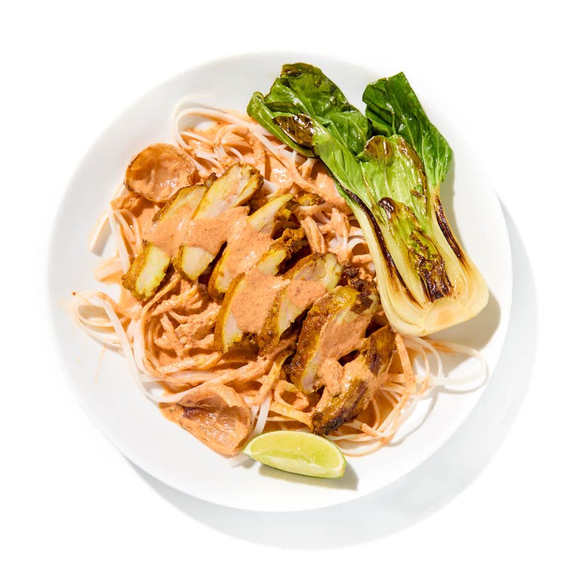 Rich and saucy, this delicious Thai-inspired chicken curry gives any weeknight dinner a major excitement upgrade. Let’s start with the chicken—succulent boneless skinless thighs get infused with the flavors of sweet ginger and earthy turmeric, then seared to lock in flavor and juiciness. Next comes the sauce—a creamy blend of coconut milk, mildly spicy red curry paste, fragrant fresh herbs, aromatic vegetables, and a burst of tangy lime juice. Then there’s the tender tangle of rice noodles and a side of crisp-tender sautéed baby bok choy. Generously portioned, it makes for a hearty dinner with a hard-to beat combination of flavors and textures.