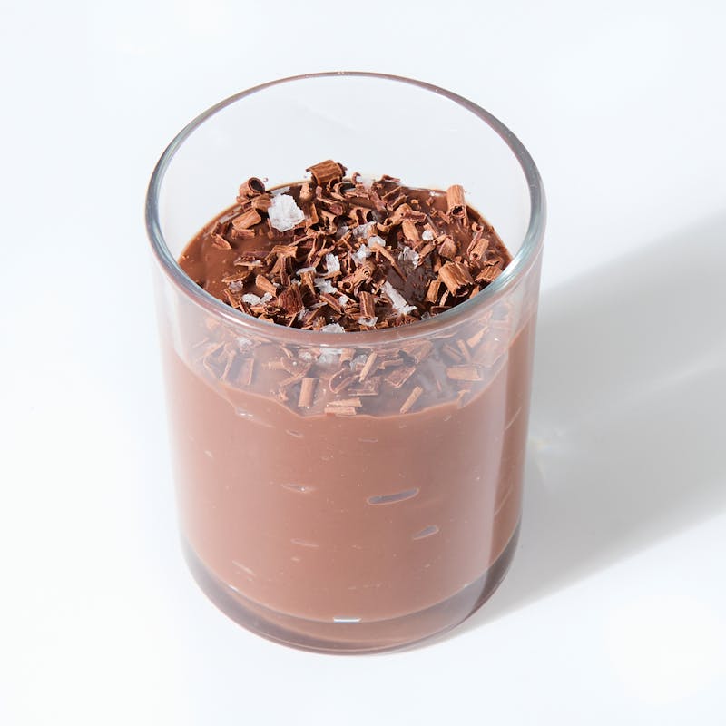 This creamy custard gets its richness from dark chocolate and a touch of butter, finished with a sprinkle of chocolate bits and a pinch of flaky salt to deepen the flavor.