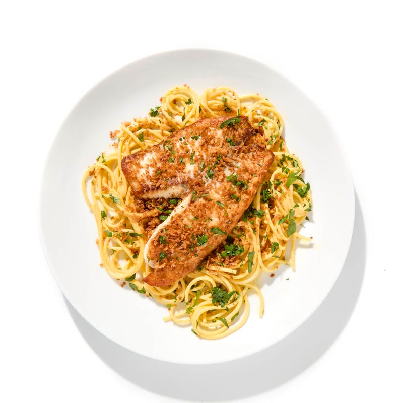 Tilapia, Linguine, Feta Cheese, Evaporated Milk, Panko Breadcrumbs, Pepper, Chile, Aji amarillo, Puree, Extra Virgin Olive Oil, Canola and Olive Oil Blend, Garlic, Walnuts, Italian Parsley, Lemon, Kosher Salt, Black Pepper