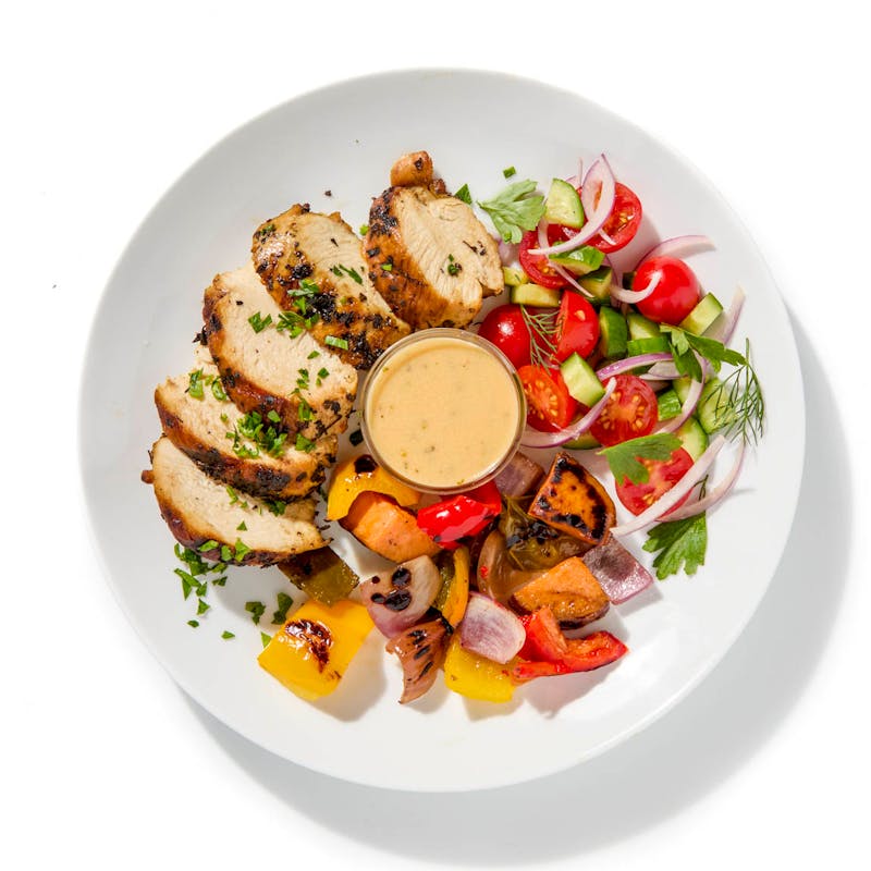 Chicken Breast, Red Onion, Cherry Tomato, Green Bell Pepper, Cucumber, Sweet Potatoes, Yellow Bell Pepper, Extra Virgin Olive Oil, Butter, Red Bell Pepper, Garlic, Italian Parsley, Feta Cheese, Lemon Juice, Dill, Mint, Avocado Oil, Red Wine Vinegar, Lime Juice, Kosher Salt, Crushed Red Pepper, Black Pepper, Lemon Zest, Dijon Mustard, Oregano