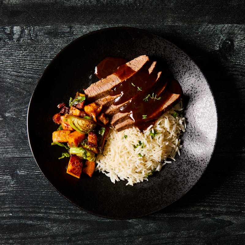 Slow-braised beef brisket comes glazed in a rich, housemade reduction until meltingly tender. Enjoy it over fragrant, herb-infused basmati rice alongside a warm savory hash of caramelized Brussels sprouts and roasted sweet potatoes, tossed with bacon.