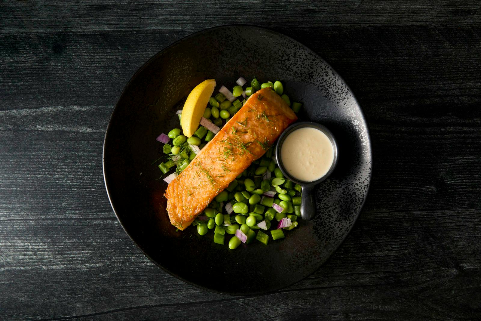 Seared salmon gets a delicate, herbal lift from a white wine–fennel cream sauce served on the side. A cool salad of blanched edamame, green beans, and tahini-soy vinaigrette balances richness with crunch, acidity, and freshness.