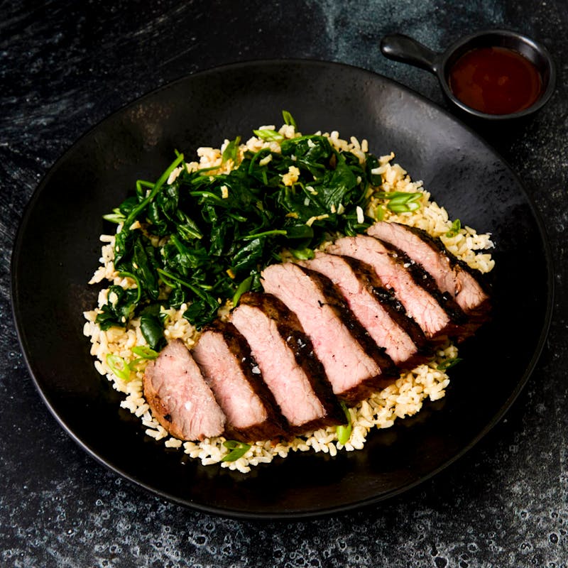 Soy-marinated flank steak is grilled and sliced, then paired with nutty brown rice and garlic-sautéed spinach. A side of gochujang sauce blends gentle heat with sesame depth.
