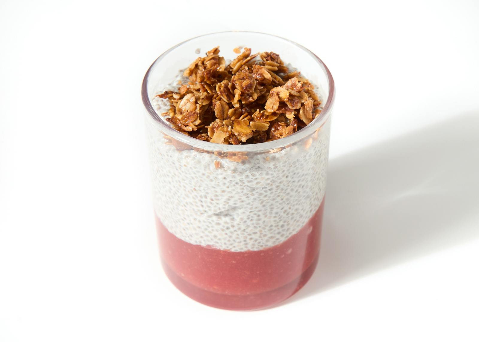 This wholesome breakfast features a creamy coconut chia base, layered with a simmered strawberry jam and a crumble of oat granola.
