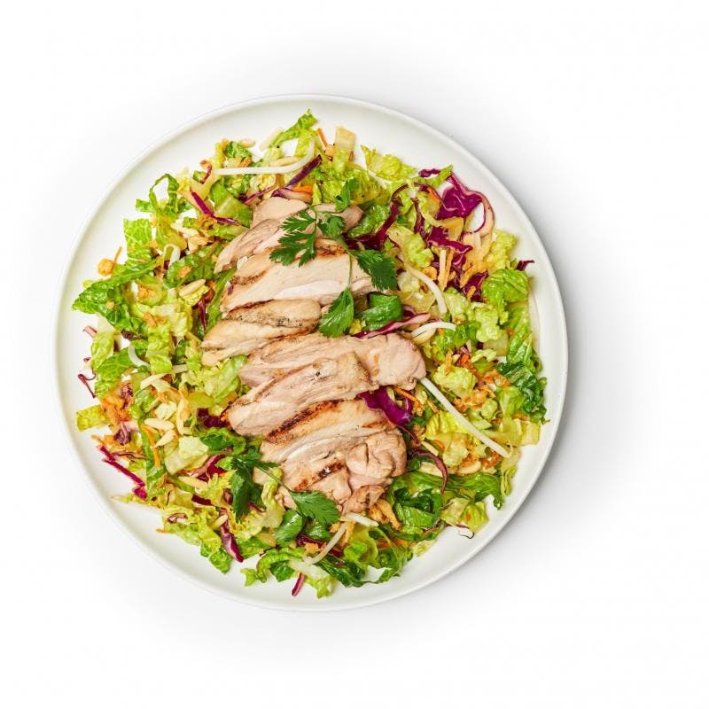 Chicken Thigh, Fish Sauce, Carrots, Almonds, Romaine Lettuce, Onion Powder, Cilantro, Garlic, Thai Red Peppers, Sugar, Light Soy Sauce, Kosher Salt, Crispy Fried Onions, Coconut Milk, Lime Juice, Rice Wine Vinegar, Green Onion, Crushed Red Pepper, Red Cabbage, Canola Oil, Ginger Powder