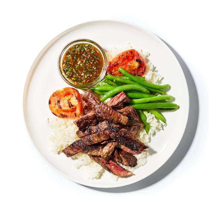 Tamarind, Flank Steak, Canola and Olive Oil Blend, Brown Sugar, Fish Sauce, Plum Tomato, Garlic Powder, Black Pepper, Cilantro, Garlic, Jasmine Rice, Kosher Salt, Green Beans, Shallot, Green Onion, Palm Sugar, Crushed Red Pepper, Canola Oil