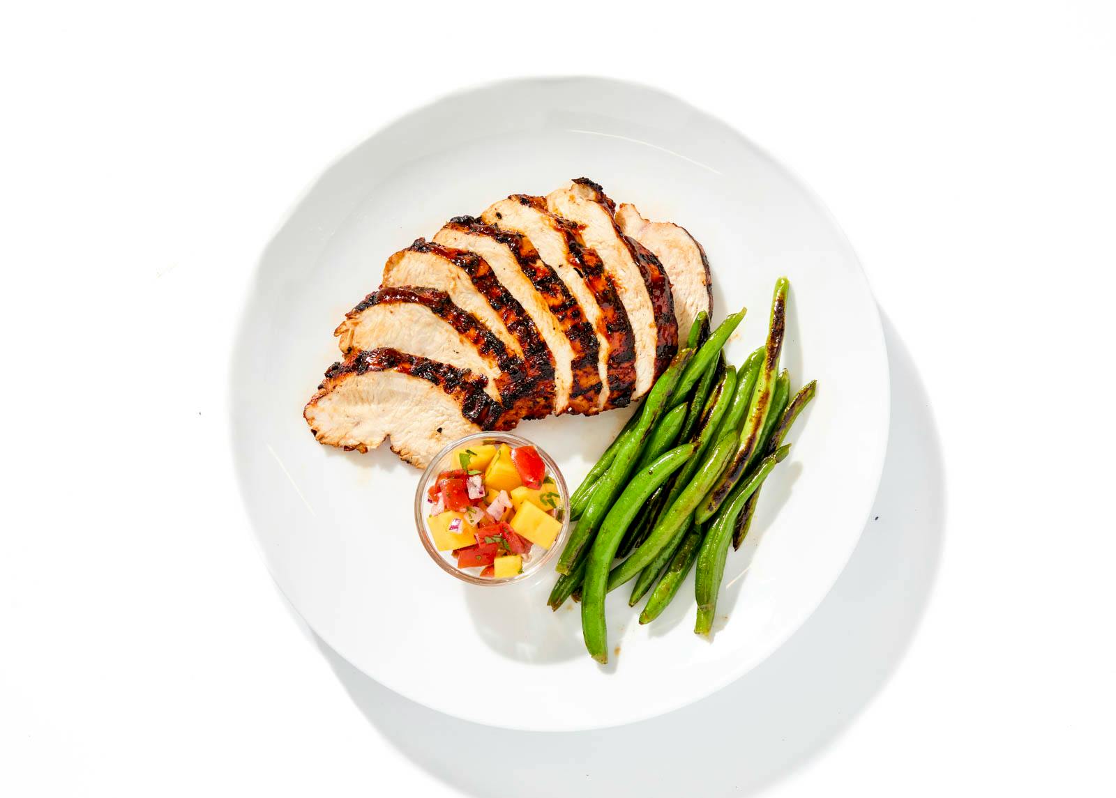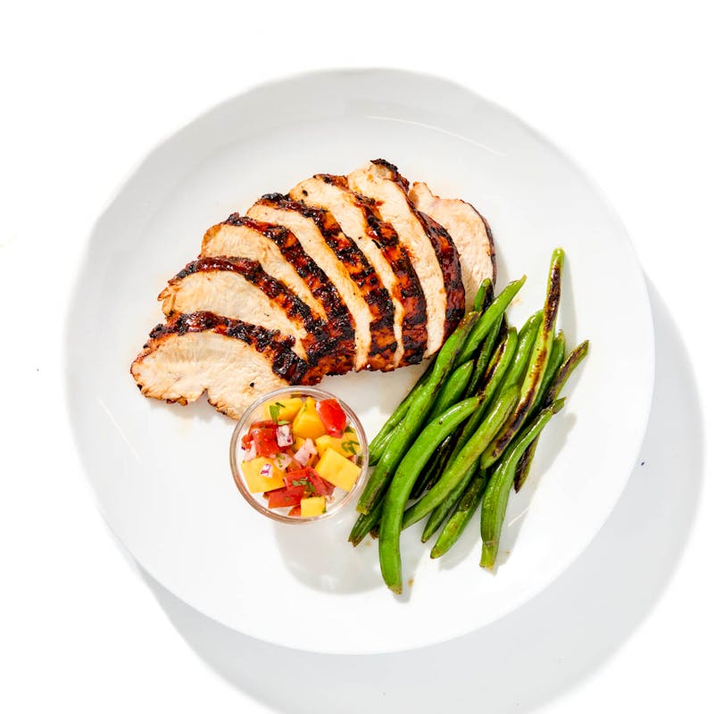 Sweet, tangy chamoy gives this grilled chicken its signature glaze. Roasted green beans bring savory balance, while mango pico de gallo on the side adds freshness that keeps the dish feeling light.