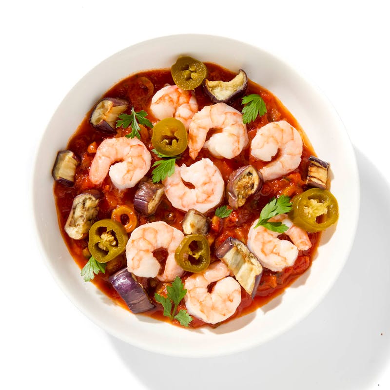 Chef Rick's take on this coastal Mexican classic stars shrimp simmered in a briny, sweet-savory sauce of tomatoes, onions, olives, capers, and clam juice. It’s even better with roasted eggplant and topped with parsley and pickled jalapeño for brightness and bite.