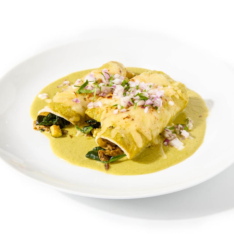 In these creamy, tangy enchiladas, Chef Rick tucks roasted zucchini, golden-seared oyster mushrooms, and wilted spinach into soft corn tortillas, then blankets them in a silky tomatillo cream sauce. A generous layer of melted jack cheese adds richness, while fresh cilantro and red onion cut through with bite.