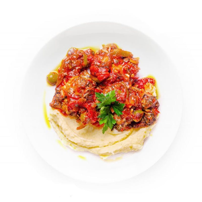 This is a traditional Italian "hunter-style" dish that's hearty and deeply flavored. Marinated chicken is slow-cooked in a deeply savory tomato sauce made with olives, mushrooms, and lots of herbs until super tender. Served over silky mashed potatoes, this dish will bring a taste of the trattoria to your table.