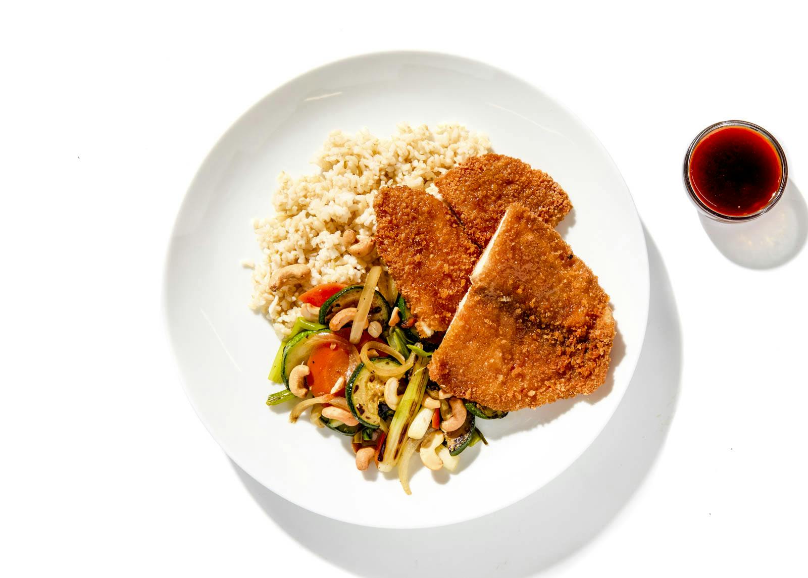 This lighter twist on a Chinese classic features crispy tilapia fillets with a sweet-and-spicy kung pao sauce, served alongside brown rice and seared zucchini, carrots, and onions. Toasted cashews bring a crunchy, nutty finish to every bite.