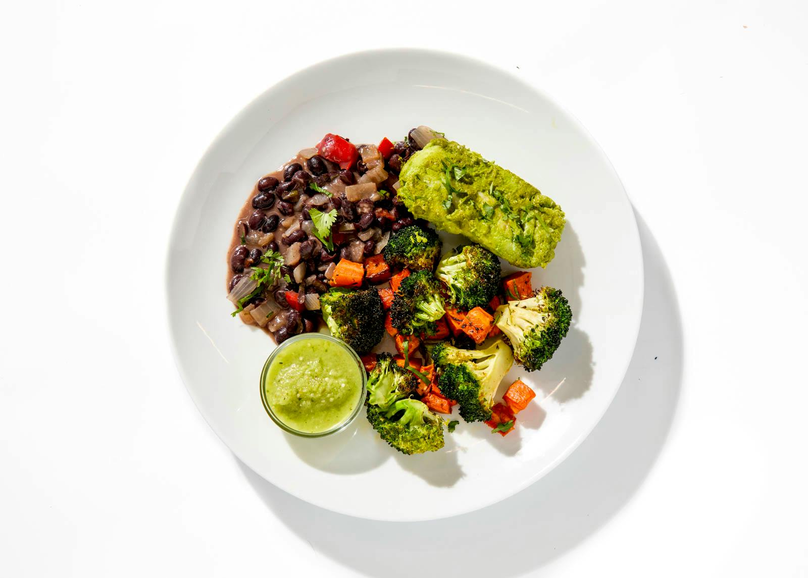 Chef Jose's citrus-marinated cod comes served over roasted carrots and broccoli with a hearty black bean stew. A fresh salsa verde rounds things out with tang and zip.