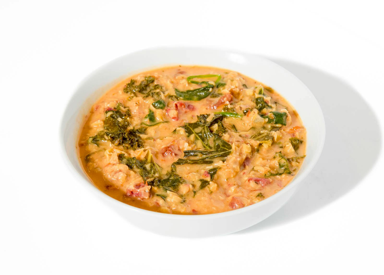 A cozy and comforting bowl of red lentils simmered with savory sun-dried tomatoes, fragrant garlic, and a touch of Italian herbs. Bright kale adds a fresh, vibrant bite, while shaved parmesan and fresh basil round out the flavors.