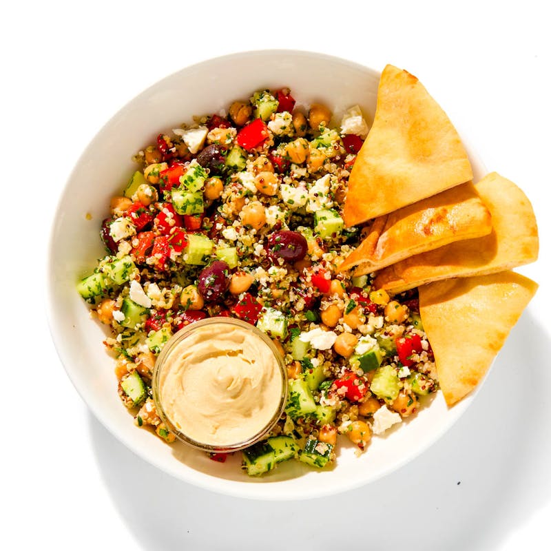Canola and Olive Oil Blend, Extra Virgin Olive Oil, Oregano, Tahini Paste, Cumin, Garlic, Kalamata Olives, Feta Cheese, White Pepper, Kosher Salt, Cucumber, Canned Chickpeas, Pita Bread, Tri-color Quinoa, Lemon Juice, Red Bell Pepper, Italian Parsley