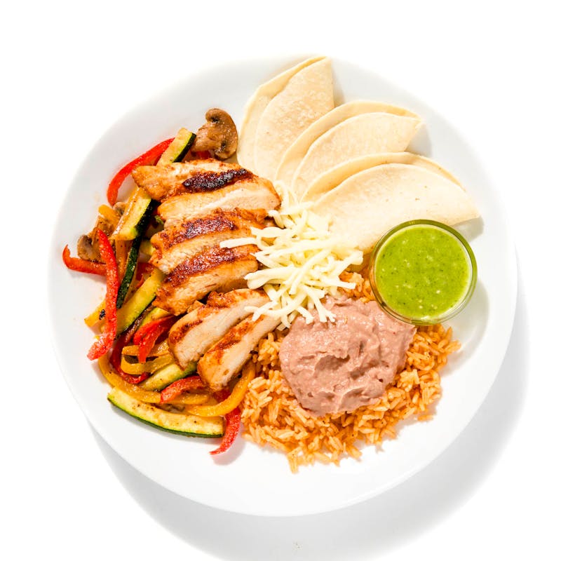 Grilled achiote-marinated chicken is layered over sautéed peppers, onions, and mushrooms, then topped with melty mozzarella and served with corn tortillas. Served with creamy pinto beans, red rice, and a bright habanero-tomatillo salsa, this is a Mexico City street-style taco with a homemade twist.