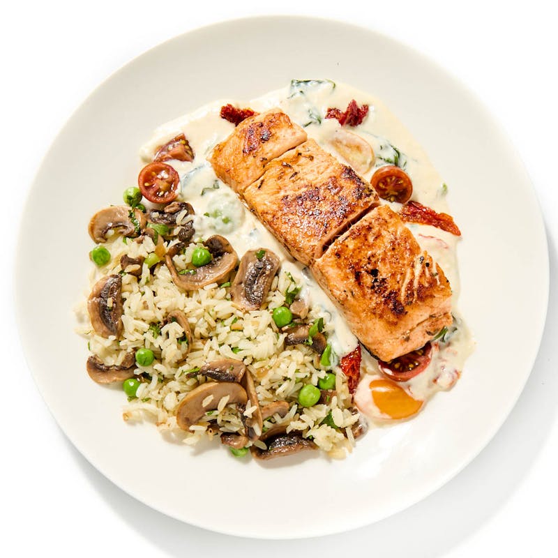You’ll love this perfectly cooked salmon fillet in a cheesy, creamy sauce, seasoned with garlic, fresh basil, parsley, and sun-dried tomatoes, and mixed with juicy baby spinach leaves and cherry tomatoes. A side of mushroom and pea rice makes for a thoroughly satisfying and well-balanced meal.