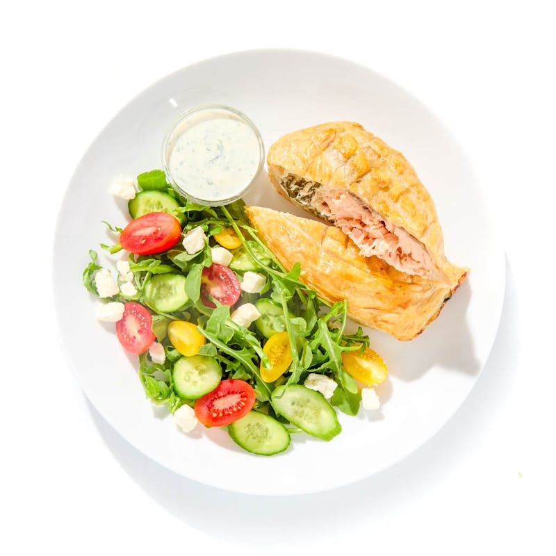 Chives, Cream Cheese, Canola and Olive Oil Blend, Butter, Spinach, Dill, Cherry Tomato, Black Pepper, Cumin, Puff Pastry, Garlic, Dijon Mustard, Egg, Feta Cheese, Kosher Salt, Cucumber, Lemon Juice, Greek Yogurt, Arugula, Salmon, Italian Parsley
