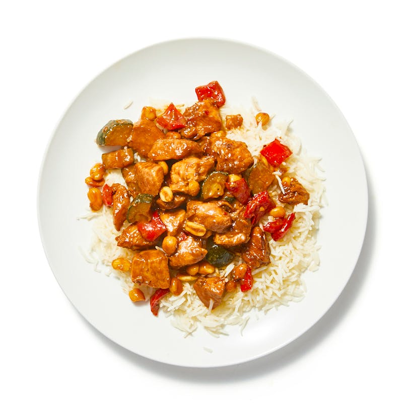 This classic Sichuan Chinese dish features tender chicken breast stir-fried to perfection, paired with a medley of red bell peppers and zucchini. The chicken is coated in the bold flavors of hoisin sauce, sesame paste, and salted chili peppers and served over fragrant basmati rice. It's a delicious blend of sweet, savory, and spicy that will transport your tastebuds to the heart of China.