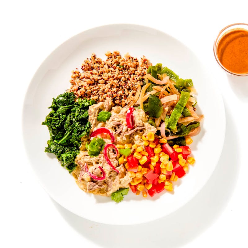Chef Akhtar is leveling up the burrito bowl. The beef here is braised low and slow in a creamy suiza-style sauce, and served alongside roasted corn, kale, and tomato over a blend of quinoa and farro. Poblano rajas and pickled onions add smoky brightness, while the chipotle-lime vinaigrette brings a final punch of heat and tang.