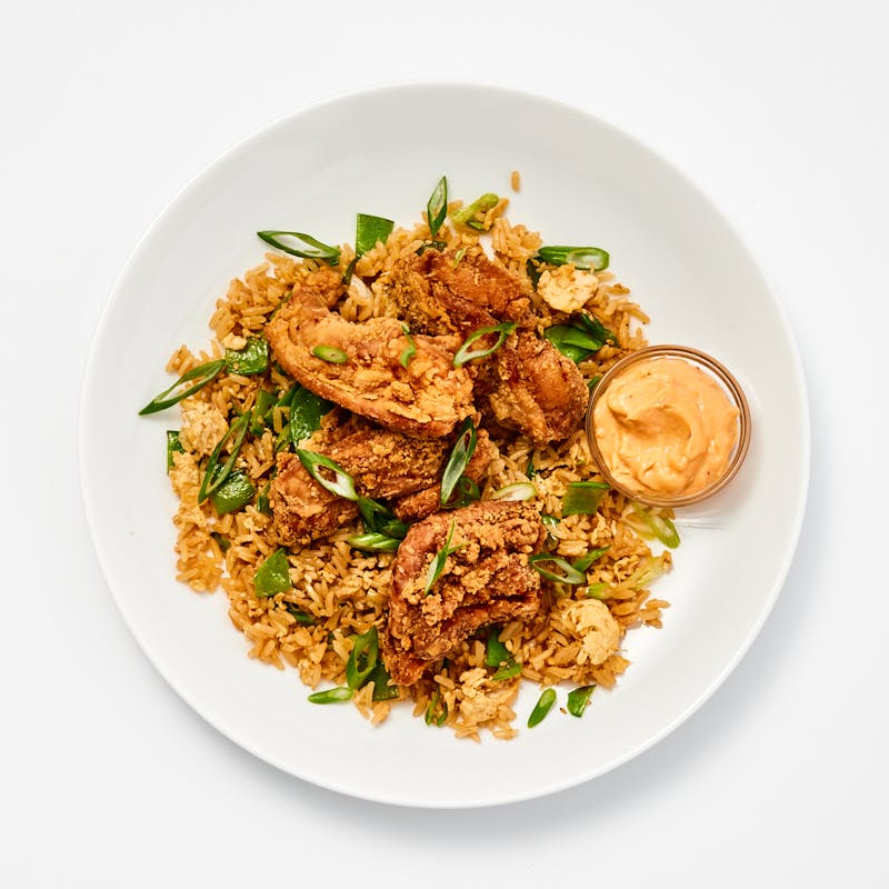 Sesame Oil, Chicken Thigh, Canola and Olive Oil Blend, Sriracha, All Purpose Flour, Sake, Black Pepper, Garlic, Egg, Corn Starch, Light Soy Sauce, Jasmine Rice, White Pepper, Kosher Salt, Green Peas, Carrots, Red Sambal Chili Paste, Mayonnaise, Green Onion, Ginger, Rice Wine, Canola Oil, Sesame Seeds