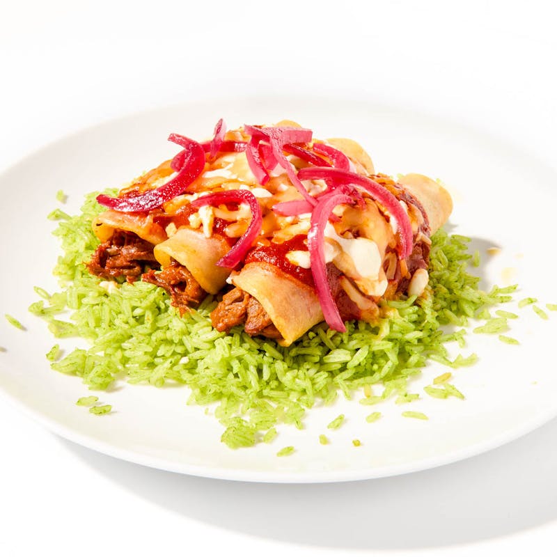 We promise you have never had enchiladas quite like these. Chef Akhtar applies a deeply flavorful adobo marinade to lamb and uses a low and slow 'barbacoa' method to achieve and tender juicy results. The lamb is then wrapped up in fresh corn tortillas, topped with bit more of the sauce the lamb was braised in, covered with Oaxaca & Chihuaha cheeses and baked until bubbly. The enchiladas are served with herby green rice and pickled red onions to add a pop of acidity for balance.