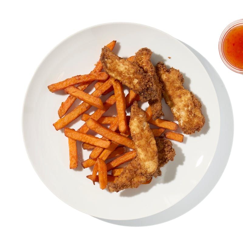 Chives, Black Pepper, Seasoned Rice Wine Vinegar, Paprika, All Purpose Flour, Canola Oil, Kosher Salt, Fish Sauce, Panko Breadcrumbs, Sweet Chili Sauce, Chicken Breast, Lime Juice, Sweet Potato Fries, Baking Powder, Garlic Powder, Gum, Xanthan, Buttermilk, Light Brown Sugar
