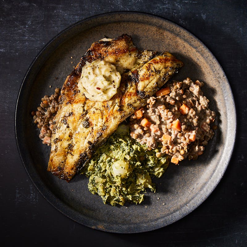 Marinated and grilled Branzino is topped with a charred scallion pesto butter and finished in oven. Charring scallions softens them up and brings out their natural sweetness, which adds depth to the rich, allium-forward compound butter. Chef Chris loves creamy French lentils cooked with garlic, thyme and mirepoix, and finds they pairs exceptionally well with a delicate protein like Branzino. This is a high protein meal that's still on the lighter side while promising elegance and balanced, satisfying flavors.