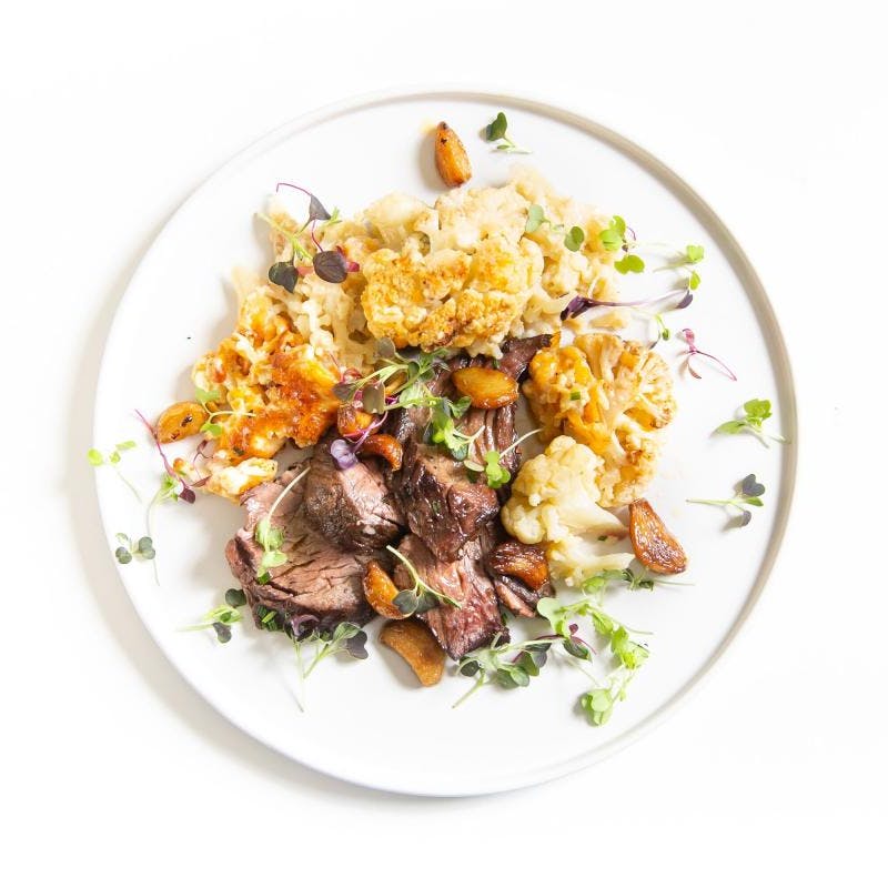 Herb-marinated flank steak is grilled then hand-sliced by a carving chef. The slices of tender, juicy steak are paired with Chef Chris’ steakhouse-style creamy three-cheese cauliflower gratin made with creamy blue cheese, nutty Swiss, and cheddar. A zippy sauce of slow-roasted garlic and crisped up chili flakes is the perfect accompaniment for this modern take on steakhouse fare. Chef highly recommends heating this meal in the microwave.