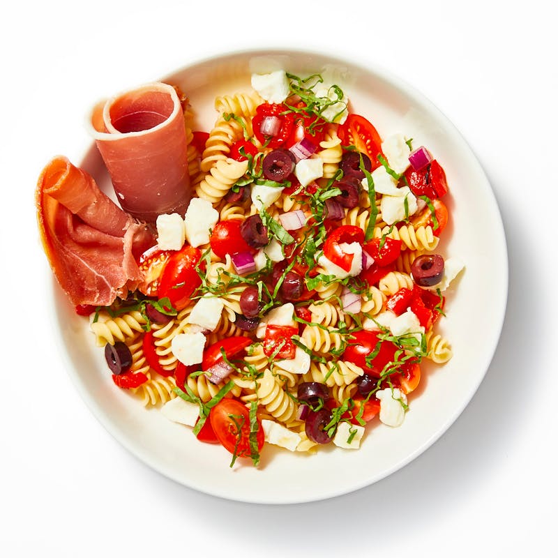 This is just a deliciously simple pasta salad loaded with bold, fresh flavors. Marinated tomatoes, fresh mozzarella, olives, basil, roasted red peppers, and prosciutto are tossed with al dente rotini pasta and a tangy red wine vinaigrette. What more could you want?