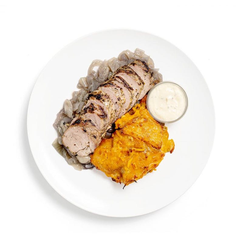 We love everything about this meal, but especially how everything plays so well with each other, making every bite a little different but equally delicious. The pork tenderloin is marinated with loads of herbs, grilled, then finished in the oven before being hand-sliced by a real carving chef. The sliced pork sits on top of a bed of caramelized onions and a rich sweet potato gratin with just a little hint of Gorgonzola cheese in it. A white wine-mustard cream sauce finishes off the dish, making it one of our forever favorites. Chef highly recommends heating this meal in the microwave.