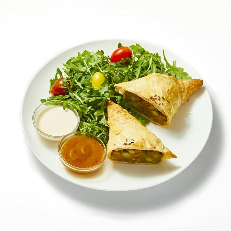 Mango Puree, Coriander Seeds, Turmeric, Cumin, Avocado Oil, Cherry Tomato, Garlic Powder, Curry Leaf, Cilantro, Puff Pastry, Sugar, Potato, Onion, Peas, Kosher Salt, Espelette Pepper , Lime Juice, Lemon Juice, Greek Yogurt, Ginger, Arugula, Citric Acid