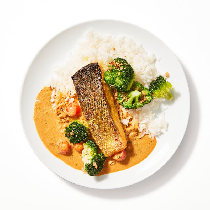 Curry Powder, Tamarind, Coriander Seeds, Garlic, Turmeric, Cumin, Avocado Oil, Broccoli , Curry Leaf, Cilantro, Garlic, Onion, Jasmine Rice, Kosher Salt, Espelette Pepper , Canned Cherry Tomatoes, Coconut Milk, Ginger, Salmon