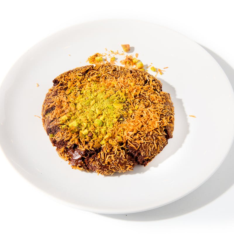 Butter, Semi Sweet Chocolate Pistoles, All Purpose Flour, Brown Sugar, Pastry, Kataifi, Pistachios, Egg, Cocoa Powder, Sugar, Sugar, Powdered, 10X, Avocado Oil, Miso Paste, Tahini Paste, Vanilla Extract, Baking Soda, Kosher Salt