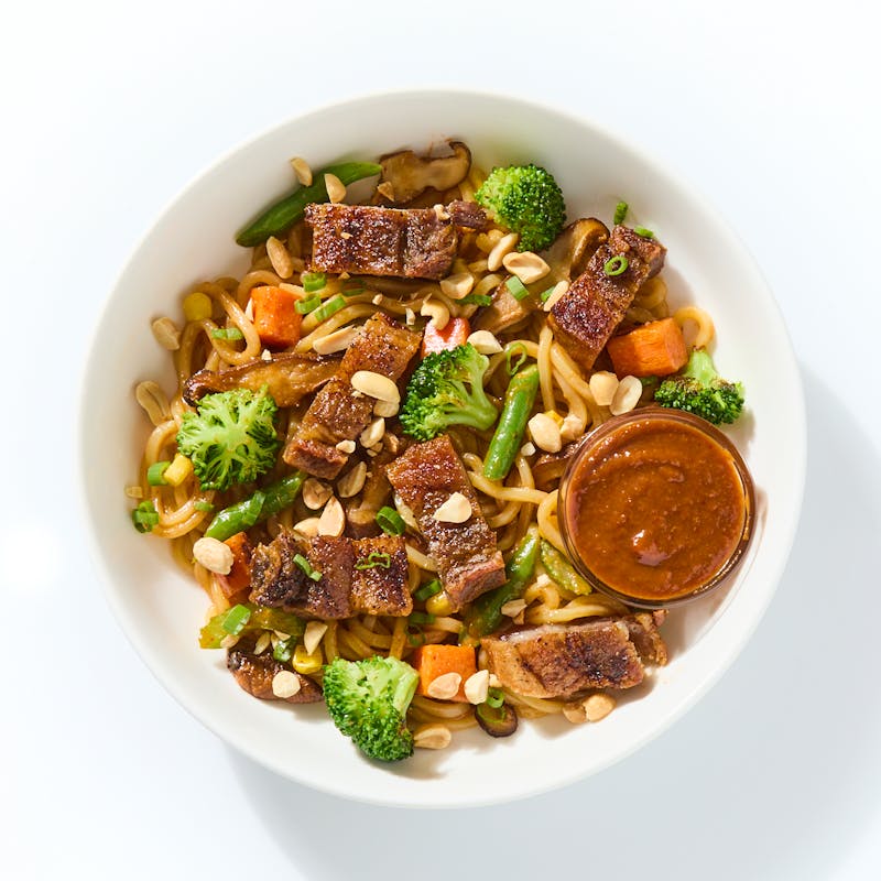 Sugar, Soy Sauce, Celery, Black Pepper, Sesame Oil, Rice Wine Vinegar, Carrots, Thick Wonton Noodles, Green Beans, Kosher Salt, Shiitake Mushrooms, Chile de Arbol, Clove, Pork Belly, Oyster Sauce, Rice Wine, Guajillo Chile, Green Onion, Broccoli , Garlic, Dried Figs, Cinnamon, Ginger, Canola and Olive Oil Blend, Corn, Onion, Peanuts