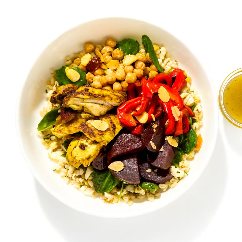 Chicken Thigh, Red Bell Pepper, Golden Beetroots, Beetroot, Canned Chickpeas, Barley, Greek Yogurt, Extra Virgin Olive Oil, Almonds, Honey, Dried Medjool Dates, Lemon Juice, White Wine Vinegar, Italian Parsley, Lemon Zest, Kosher Salt, Garlic Powder, Za'atar, Thyme, Dijon Mustard, Garlic, Black Pepper, Oregano, Dill, Turmeric, Ginger Powder, Dried Mint, Crushed Red Pepper
