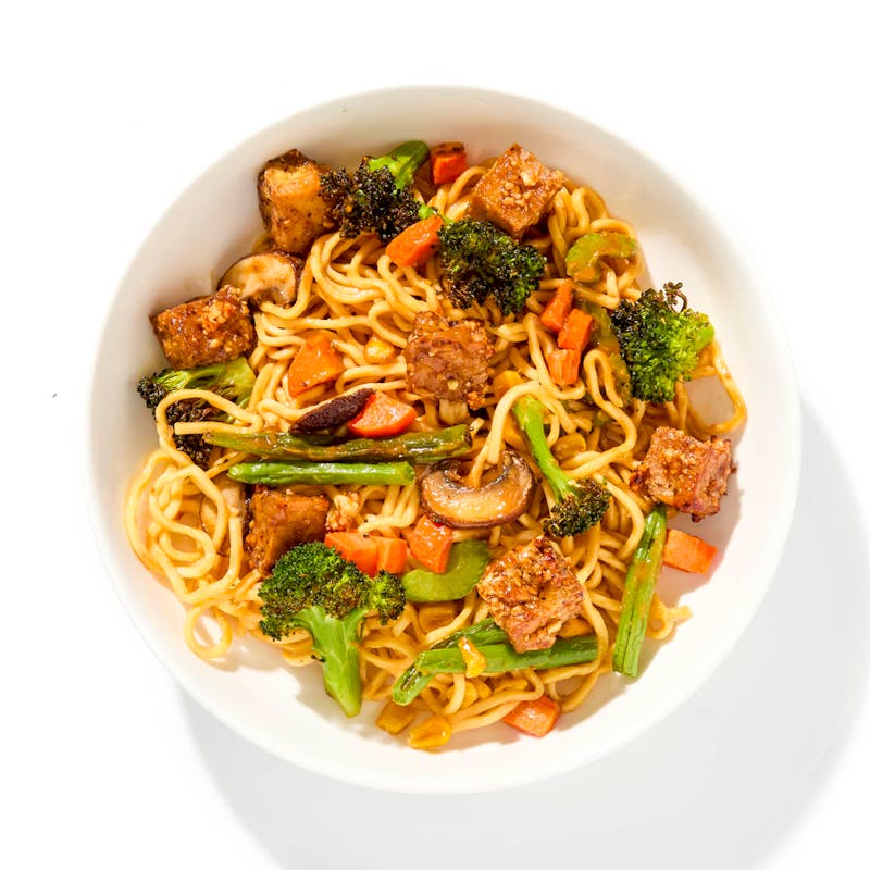 Tofu, Sugar, Soy Sauce, Celery, Sesame Oil, Rice Wine Vinegar, Carrots, Thick Wonton Noodles, Green Beans, Shiitake Mushrooms, Chile de Arbol, Clove, Oyster Sauce, Rice Wine, Guajillo Chile, Green Onion, Broccoli , Garlic, Dried Figs, Cinnamon, Ginger, Canola and Olive Oil Blend, Corn, Onion, Peanuts