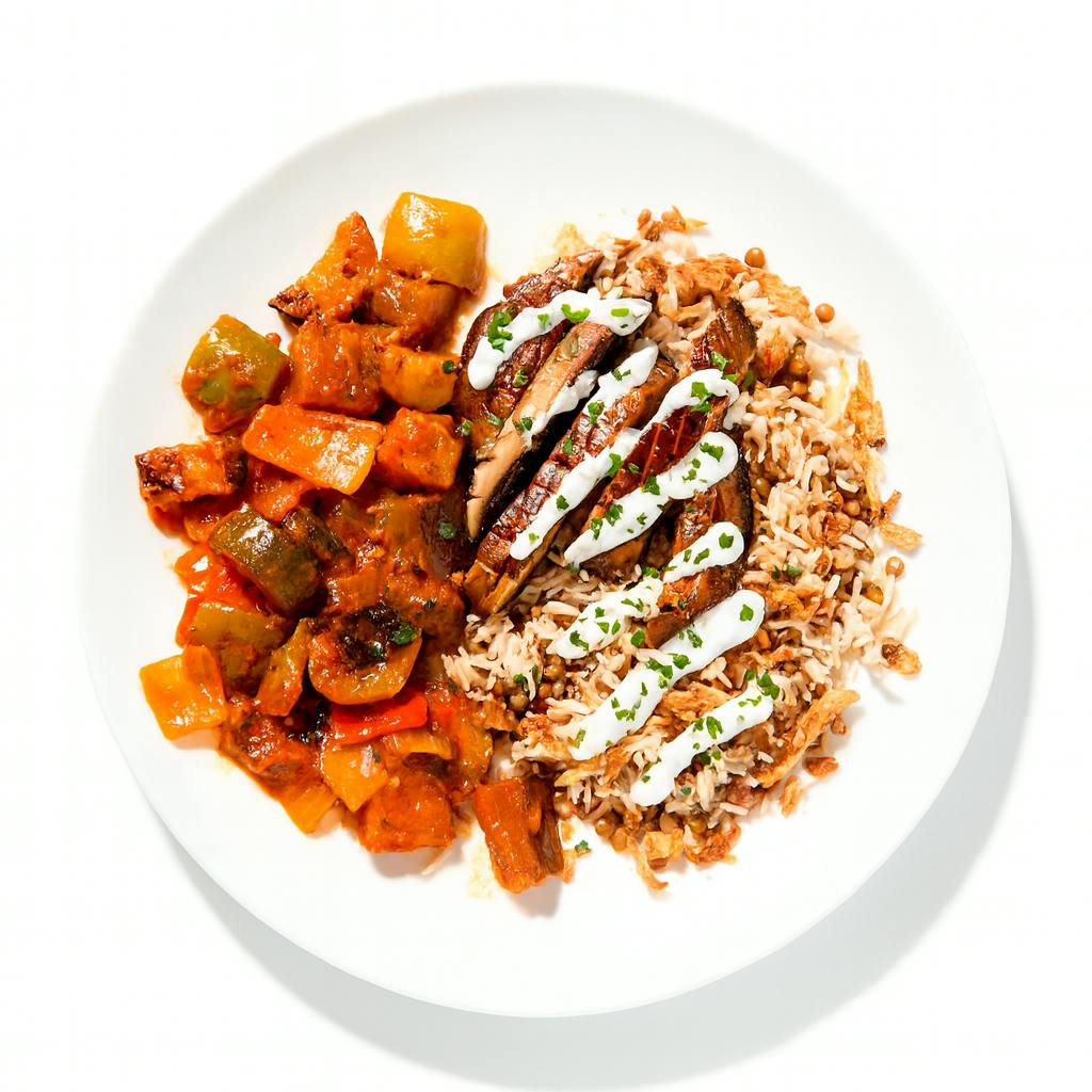 Rosemary, Dill, Extra Virgin Olive Oil, Dill, Vegetable Base, Garlic Powder, Black Pepper, Tomato Paste, Garlic, Canned Tomato, Honey, Portabello Mushrooms, Oregano, White Wine Vinegar, Zucchini, Onion, Basmati Rice, Kosher Salt, Brown Lentils, Eggplant, Lemon Juice, Greek Yogurt, Green Bell Pepper, White Wine, Red Bell Pepper, Italian Parsley